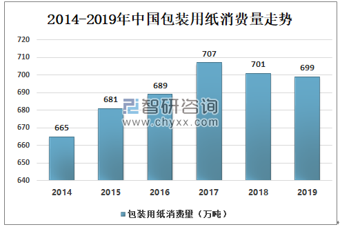 然而最近的幾年里,中國消費品出口增速下降,甚至有部分產品的產地從中國轉移到了其他新興市場,導致相應的出口商品包裝用紙需求增速放緩。從2017年包裝紙消費量的707萬噸開始下降到2019年包裝用紙消費量699萬噸。