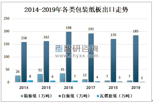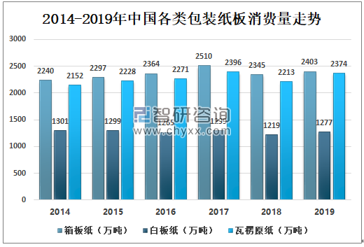 2019年中國箱板紙消費量為2403萬噸,比去年增加58萬噸;2019年白板紙消費量為1277萬噸,比全年增加58萬噸;2019年瓦楞原紙消費量為2374萬噸,比去年增加161萬噸。