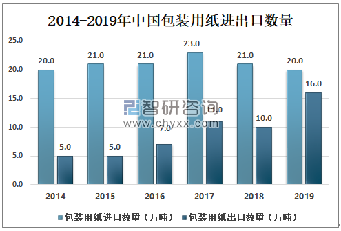 包裝用紙對應的下游是消費品,后者的增速直接影響也裝紙的需求。商品出口快速增加促使包裝需求猛增,同包裝附紙領域里,不論是白紙板還是箱扳楞紙,現飛速發展狀態。包裝用紙進口數量大于出口數量,2018年中國包裝紙進口數量為21萬噸,出口數量為10萬噸,相差11萬噸。2019年中國包裝紙進出口只相差4萬噸。