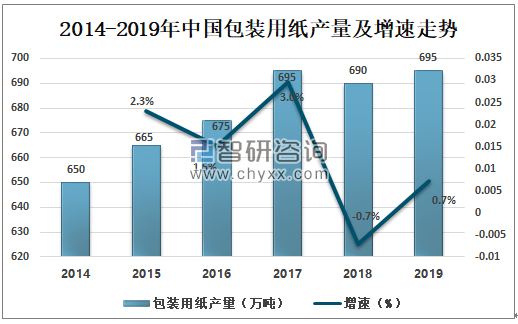 快遞業務的收入規模和快遞數量都呈現出井噴式增長,即便近年來增速有所下滑,但是也還是維持在20%以上的超高增長速度,屬于行業從初期的野蠻式增長到逐漸成熟階段的自然過渡。電商業務的快速發展離不開與之相配的線下物流和快遞配送,受電子商務、快遞物流快速發展的拉動。包裝用紙從2014-2017年一直是上漲趨勢,2018年包裝用紙產量690萬噸,2019年包裝用紙產量為695萬噸,同比增加0.7%。