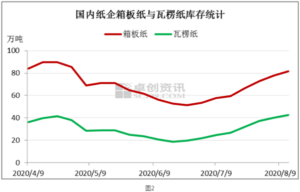 由于原紙需求減少,紙企原紙庫存也在大幅增加。根據卓創資訊統計的49家樣板紙企的箱板原紙周度庫存看,從7月2日當周箱板原紙增加以來,截止8月13日當周,瓦楞原紙庫存增加幅度近60%。而瓦楞紙周度庫存較6月18日當周的年內低點增加了128%。包裝原紙庫存大幅增加的原因一方面是,國內紙企的開工率保持相對高位;另一方面是則是下游原紙需求減弱,紙企原紙由主動補庫存快速轉化為被動補庫存。