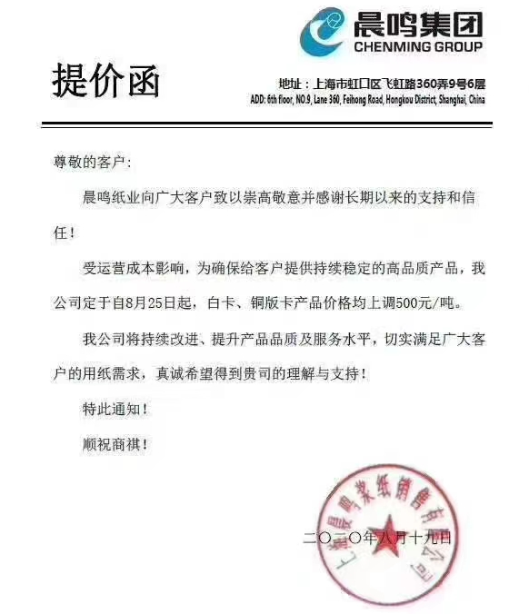 8月19日,晨鳴集團發布漲價函稱,受營運成本影響,自8月25日起,白卡、銅版卡產品價格均上調500元/噸。