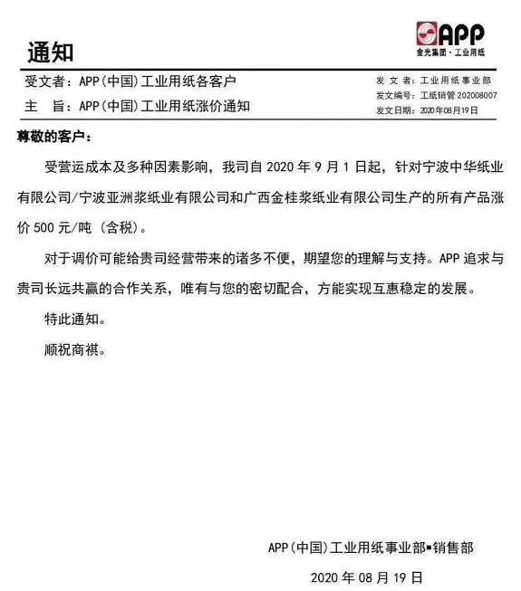 同日,APP金光紙業宣布,自2020年9月1日起,針對寧波中華紙業有限公司、寧波亞洲漿紙業有限公司和廣西金桂漿紙業有限公司生產的所有產品漲價500元/噸(含稅)。