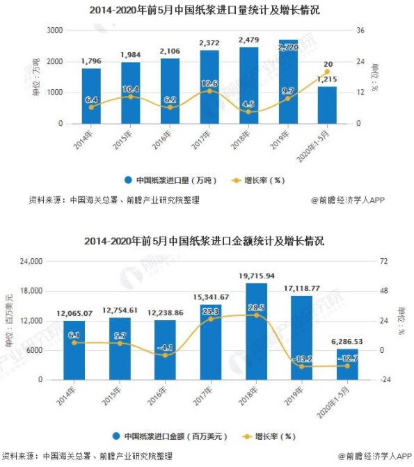 據中國海關總署統計數據顯示,2019年去年中國紙漿進口量達到了2720萬噸,累計增長9.7%。截止至2020年5月中國紙漿進口量為228萬噸,同比下降7%。累計方面,2020年1-5月中國紙漿進口量達到1215萬噸,相比上年同期增長了202萬噸,累計增長20%。