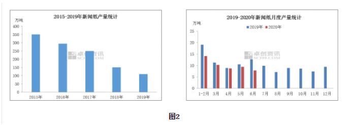 據國家統計局數據顯示,近年來新聞紙產量呈現逐年下降的趨勢,且下調幅度較大。2020年1-6月累計產量50.3萬噸,同比下滑18.9%。