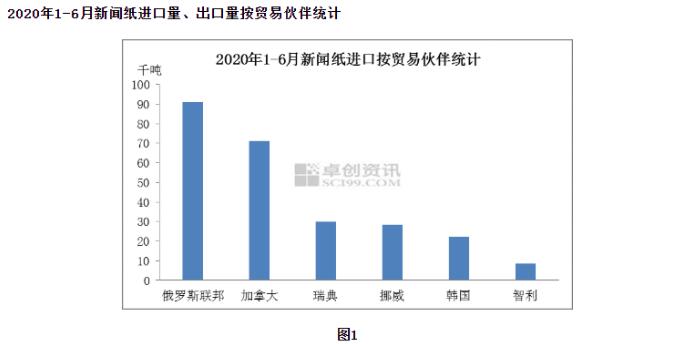由上圖可見,新聞紙進口2020年上半年按貿易伙伴統計中,俄羅斯占據首位,進口量91.15千噸,占比高達31.02%,其次為加拿大,進口量71.25千噸,占比24.25%。進口量前6位的貿易伙伴占總進口量的85.54%。
