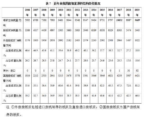 2019年我國廢紙漿消耗量為5443萬噸,其中外廢廢紙漿消耗量1022萬噸,占廢紙漿總消耗量的18.8%,占紙漿總消耗量的10.6%。由表7可以看出,我國國廢廢紙漿消耗量在廢紙漿消耗總量中占主要地位,且比重逐年上升,2019年達到81.2%,較上年增加了8.4個百分點。