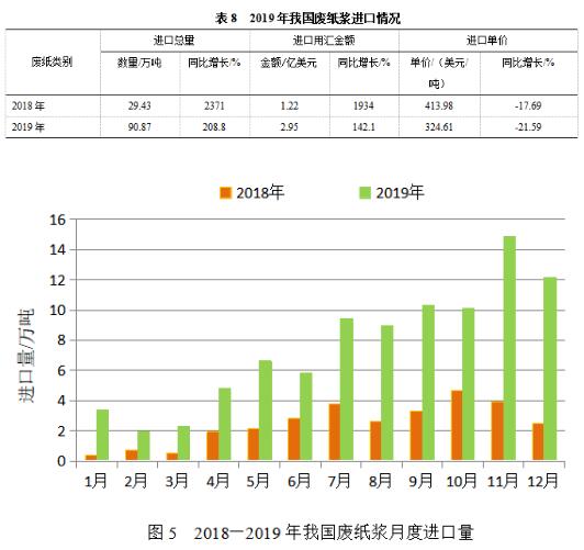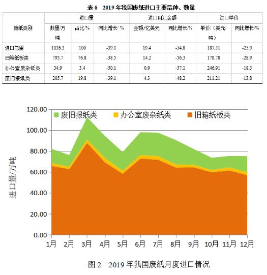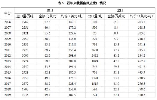 據海關統計,2019年,我國進口廢紙總量1036萬噸,同比增長-39.1%;用匯金額19.4億美元,同比增長-54.8%;進口廢紙的平均價格為187.51美元/噸,同比增長-25.9%。