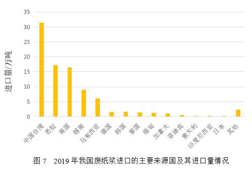 我國進口的廢紙漿主要來自中國臺灣、老撾、美國、越南、馬來西亞5個國家及地區,從這個5個國家及地區的廢紙漿進口量達80.3萬噸,占我國總廢紙漿進口量的88%(見圖7)。