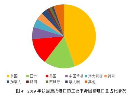 我國進口的廢紙一直主要來自美國、歐洲和日本3個地區,其中,美國、日本、英國一直是我國最大的三個進口廢紙來源國,2019年我國自美國、日本和英國的廢紙進口量分別為461.0萬噸、164.5萬噸和137.2萬噸,分別占我國總廢紙進口量的44.5%、15.9%和13.2%(見圖4)。