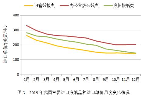 2019年進口廢紙具體種類、數量及單價情況見表6。主要廢紙品種月度進口情況及進口單價變化情況如圖2~圖3所示。在廢紙進口單價方面,由圖3可見,舊箱紙板、辦公室廢雜紙及廢舊報紙類的進口單價全年逐月一路走低,12月均價分別為139.02美元/噸、201.16美元/噸、143.34美元/噸,較1月均價分別下降了46.9%、38.9%及49.0%。