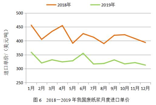 2019年,我國直接從海外進口廢紙漿的總量90.9萬噸,為2018年的3.08倍;進口用匯總額2.95億美元,為2018年的2.42倍;進口單價324.61美元/噸,同比增長-21.59%(見表8)。2018—2019年我國廢紙漿月度進口量及進口單價變化情況如圖5~圖6所示,進口數量與進口單價呈現一增一減變化趨勢。2019年,我國廢紙漿出口量為392.5噸,出口單價為802.7美元/噸。