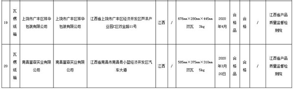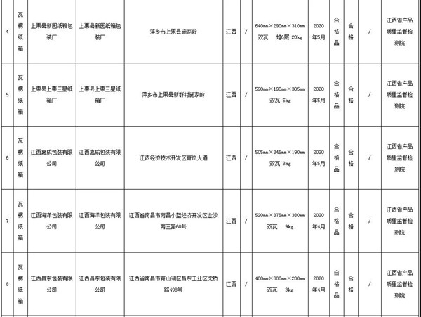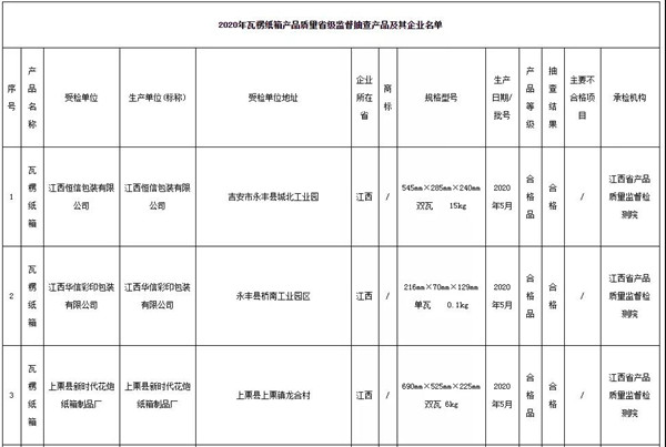 中國質量新聞網訊 據江西省市場監督管理局網站2020年12月31日消息,近期,江西省市場監督管理局對全省瓦楞紙箱產品質量進行了監督抽查。本次抽查了20批次產品,經檢驗,全部合格。