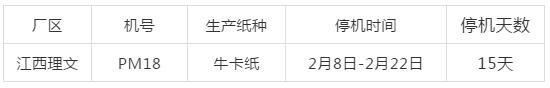 2021年1月6日,江西理文造紙有限公司發(fā)布通知稱,因生產(chǎn)機(jī)器設(shè)備需進(jìn)行停機(jī)檢修,生產(chǎn)牛卡紙的PM18紙機(jī)計(jì)劃在2021年2月8日-2月22日期間停機(jī)15天。