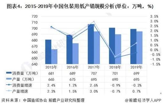 根據(jù)中國造紙協(xié)會資料,2019年包裝用紙產(chǎn)量為695萬噸,同比增長0.7%;消費(fèi)量為699萬噸,同比下降0.3%。整體來看,國內(nèi)包裝用紙?jiān)谝欢ǔ潭壬弦蕾囘M(jìn)口市場。