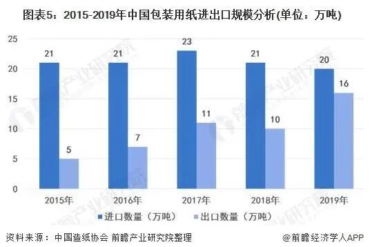 根據(jù)中國造紙協(xié)會資料,2015-2019年中國包裝用紙進(jìn)口數(shù)量較為穩(wěn)定,保持在20-23萬噸之間,出口數(shù)量逐年上升,貿(mào)易逆差逐漸縮小,到2019年中國包裝用紙進(jìn)口數(shù)量為20萬噸,出口規(guī)模為16萬噸。