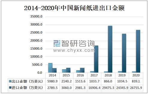 智研咨詢發(fā)布的《2021-2027年中國新聞紙行業(yè)市場全景調(diào)研及市場競爭策略報(bào)告》數(shù)據(jù)顯示:2019年中國新聞紙出口金額為1034.5萬美元,進(jìn)口金額為24345.9萬美元;2020年中國新聞紙出口金額為839.1萬美元,進(jìn)口金額為26755.9萬美元。