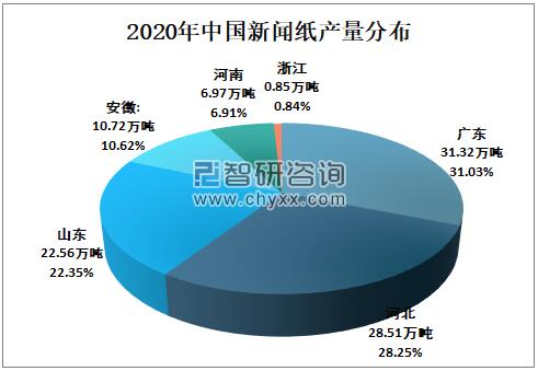 中國新聞紙產(chǎn)量主要分布在廣東、河北、山東、安徽、河南及浙江省;2020年廣東、河北、山東新聞紙產(chǎn)量分別為31.32萬噸、28.51萬噸、22.56萬噸,分別占全國總產(chǎn)量的31.03%、28.25%、22.35%。