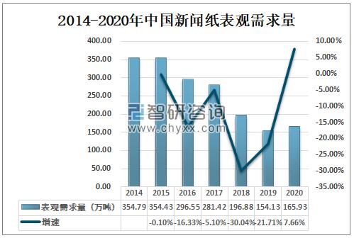 受下游市場萎靡的影響,中國新聞紙消費(fèi)量逐年下滑,2020年需求量稍有回升;2020年中國新聞紙表觀需求量為165.93萬噸,較2019年的154.13萬噸同比增長7.66%。