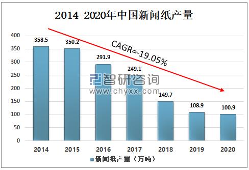 近年來,由于電子媒體盛行,導(dǎo)致報(bào)刊及書籍用紙量減少,新聞紙產(chǎn)量不斷下降。由2014年的358.5萬噸下降至2020年的100.9萬噸,年復(fù)合增長率為-19.05%。