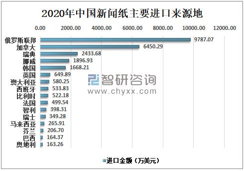 俄羅斯聯(lián)邦、加拿大及瑞典為中國新聞紙主要進(jìn)口來源地,2020年中國分別從俄羅斯聯(lián)邦、加拿大及瑞典進(jìn)口新聞紙9787.07萬美元、6450.29萬美元、2433.68萬美元,分別占總進(jìn)口金額的36.58%、24.11%、9.10%。