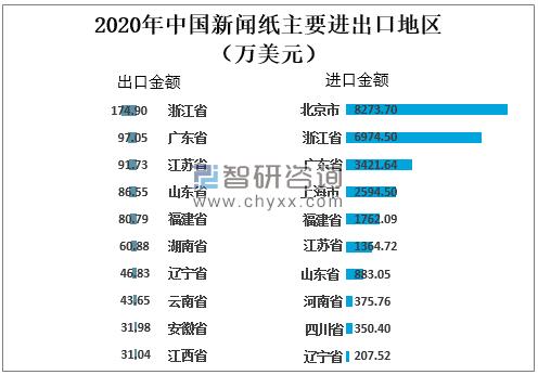 中國新聞紙出口地集中在浙江、廣東及江蘇省,2020年浙江、廣東及江蘇省新聞紙出口金額分別為174.9萬美元、97.05萬美元、91.73萬美元;進(jìn)口地則主要集中在北京市、浙江省及廣東省,2020年北京市、浙江省及廣東省新聞紙進(jìn)口金額分別為8273.7萬美元、6974.5萬美元、3421.64萬美元。