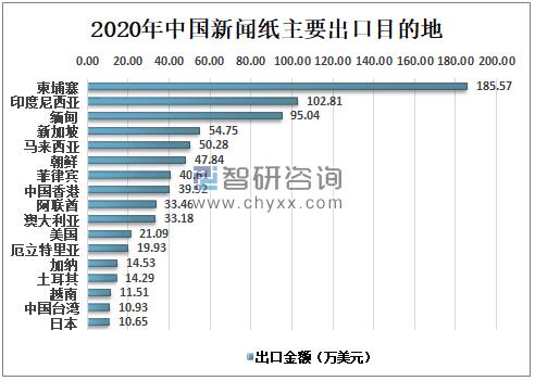 柬埔寨、印度尼西亞及緬甸為中國新聞紙主要出口地,2020年中國新聞紙出口至柬埔寨185.57萬美元,出口至印度尼西亞102.81萬美元,出口至緬甸95.04萬美元。分別占總出口金額的22.12%、12.25%、11.33%。
