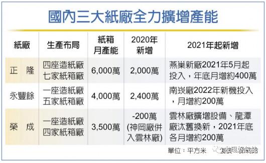 為此,當地相關企業紛紛加碼投資擴廠。僅以2021年為例,正隆紙業燕巢新廠將從5月份開始投入,年底月增約400萬平方米產能;榮成云林廠擴增設備、龍潭廠汰舊換新設備,月增各約200萬平方米產能,年底或可各增至400萬平方米產能。