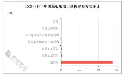 2021年1-2月份中國箱板紙進口貿易方式主要為一般貿易、進料加工貿易、來料加工貿易,進口量分別為55.01萬噸、1.05萬噸、0.98萬噸。其中一般貿易方式的瓦楞紙進口量占到了總進口量的96.16%,其余貿易方式整體占比較小。