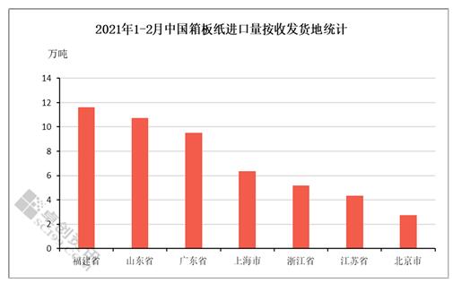 2021年1-2月份中國箱板紙進口收發地主要集中在福建省、山東省、廣東省、上海市、浙江省、江蘇省,北京市;進口量分別為11.62萬噸、10.72萬噸、9.51萬噸、6.37萬噸、5.20萬噸、4.34萬噸、2.74萬噸。其中福建省、山東省、廣東省進口量占比達56%左右。分別為福建省占總進口量的20.31%,山東省占總進口量的18.74%,廣東省占總進口量的16.63%,其余省份總占比44%左右。