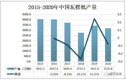 瓦楞紙作為國內(nèi)產(chǎn)量最大的紙種之一,2016年后受國內(nèi)需求放緩及廢紙進(jìn)口禁令的頒布,導(dǎo)致中國瓦楞紙產(chǎn)量整體呈下降走勢(shì)。2020年中國瓦楞紙產(chǎn)量為3170.8萬噸,較2019年的3421.0萬噸同比下降7.31%。