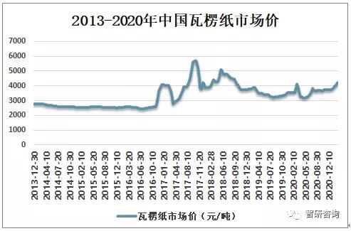 2013-2016年中國瓦楞紙市場(chǎng)價(jià)較為平穩(wěn),2016下半年后價(jià)格波動(dòng)幅度較大,2020年回歸平穩(wěn),2021年年初價(jià)格又有所上升,截止2020年12月30日,中國瓦楞紙市場(chǎng)價(jià)為3756.2元/噸。