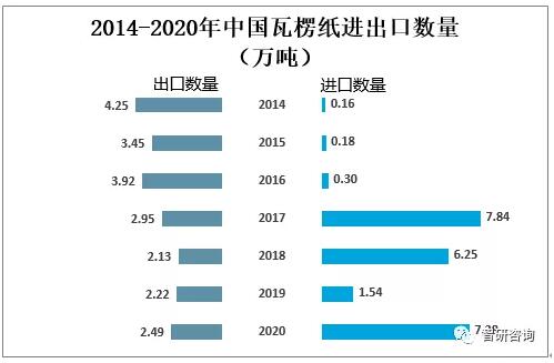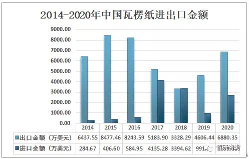 2019年中國瓦楞紙出口金額為4606.44萬美元,進(jìn)口金額為991.89萬美元;2020年中國瓦楞紙出口金額為6880.35萬美元,進(jìn)口金額為2699.88萬美元。