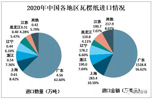 廣東省為中國最大的瓦楞紙進(jìn)口地區(qū),2020年廣東瓦楞紙進(jìn)口數(shù)量為4.56萬噸,占總進(jìn)口數(shù)量的62.60%;進(jìn)口金額為1528.8萬美元,占總進(jìn)口金額的56.62%。2020年上海瓦楞紙進(jìn)口數(shù)量為0.61萬噸,占總進(jìn)口數(shù)量的8.42%;進(jìn)口金額為283.4萬美元,占總進(jìn)口金額的10.50%。