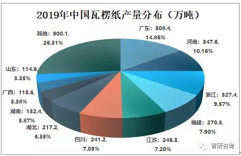 2019年中國瓦楞紙產(chǎn)量TOP5地區(qū)依次為廣東、河南、浙江、福建、江蘇,產(chǎn)量分別為508.4萬噸、347.6萬噸、327.4萬噸、270.3萬噸、246.3萬噸,占全國總產(chǎn)量的比重分別為14.86%、10.16%、9.57%、7.9%、7.2%。