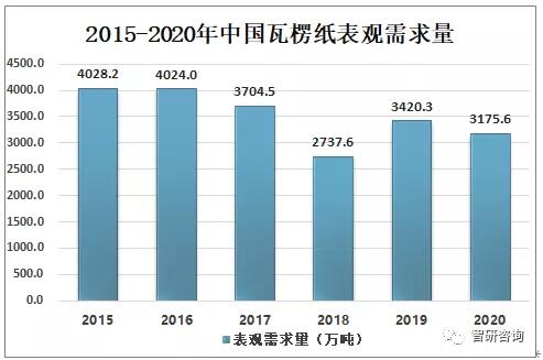 2019年中國瓦楞紙表觀需求量為3420.3萬噸,2020年中國瓦楞紙表觀需求量為3175.6萬噸,較2019年減少了244.7萬噸,同比下降7.16%。