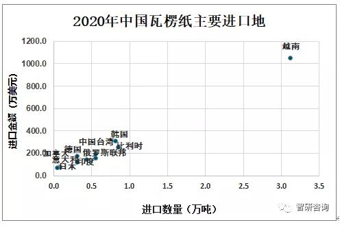 中國主要從越南進(jìn)口瓦楞紙,2020年中國從越南進(jìn)口瓦楞紙3.12萬噸,占全國總進(jìn)口數(shù)量的42.81%;進(jìn)口金額為1049.66萬美元,占總進(jìn)口金額的38.88%。2020年中國從比利時(shí)進(jìn)口瓦楞紙0.85萬噸,進(jìn)口金額為255.88萬美元。
