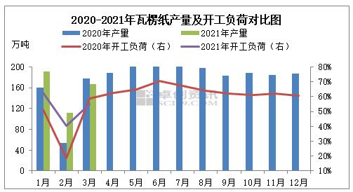 進入2021年后,國內原紙價格進入了上漲的快車道,市場對經濟向好預期增強,造紙利潤上升,紙企也在提升開工率。尤其是今年春節期間,就地過年的政策,使得紙企的開工負荷保持了相對的高位,1-2月份,瓦楞紙產量都較去年出現較大幅度的增加。3月份產量出現一定的回落,主要是受國內環保政策的影響,北方部分地區出現強制限產的所致。