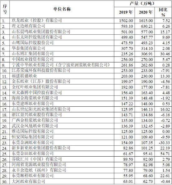 附表:2020年重點造紙企業產量前30名企業