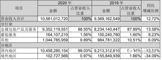 財報顯示,在奧瑞金2020年的105.61億元收入中,金屬包裝產(chǎn)品及服務(wù)業(yè)務(wù)收入為93.52億元,同比增長13.58%,占總營收的88.55%;灌裝服務(wù)業(yè)務(wù)收入為1.64億元,同比增長9.23%;其他收入為10.45億元,同比增長6.09%。