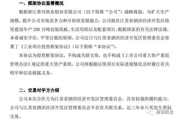 公告顯示,景興紙業與江蘇省泗洪經濟開發區管理委員會簽署了《工業項目投資框架協議》,擬在該開發區投資建設年產200萬噸包裝紙板、生活用紙及配套項目。