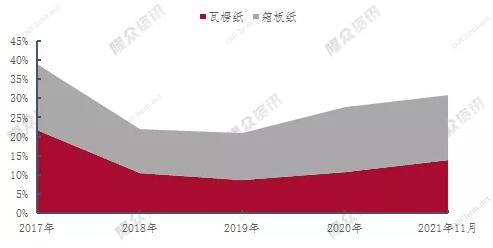 從毛利率情況來看,近五年,瓦楞及箱板紙毛利率均先降后增,毛利率走勢一致。