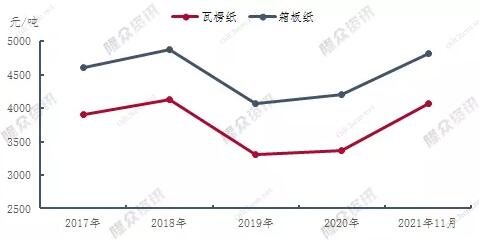 2021年中國瓦楞及箱板紙產(chǎn)品市場價(jià)格均出現(xiàn)大幅上漲,主因2021年開始廢紙系市場正式進(jìn)入“無外廢”時(shí)代,原料廢紙供應(yīng)偏緊張,價(jià)格難降,成本支撐影響下瓦楞及箱板紙產(chǎn)品均高位運(yùn)行,同時(shí)公共衛(wèi)生事件、極端天氣等外部因素繼續(xù)擾動市場,紙企開工率低位,供應(yīng)量偏緊張。據(jù)隆眾資訊統(tǒng)計(jì),2021年截至11月份,瓦楞紙產(chǎn)品年均價(jià)4071元/噸,2021年箱板紙產(chǎn)品均價(jià)4872元/噸,均處于近幾年高位水平。