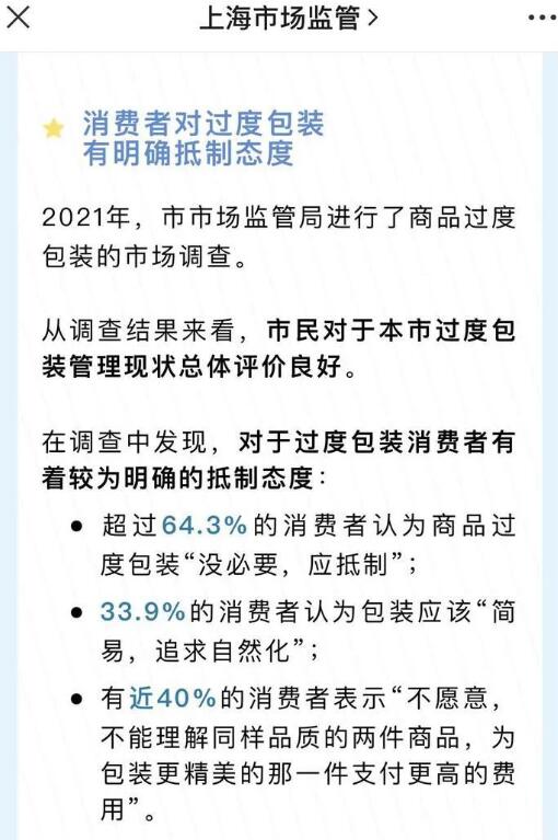 今年1月,上海市場監管曾發布微信文章,顯示2021年上海市市場監管局進行了商品過度包裝的市場調查。從調查結果來看,市民對于本市過度包裝管理現狀總體評價良好超過64.3%的消費者認為商品過度包裝“沒必要,應抵制”;33.9%的消費者認為包裝應該“簡易,追求自然化”;有近40%的消費者表示“不愿意,不能理解同樣品質的兩件商品,為包裝更精美的那一件支付更高的費用”。