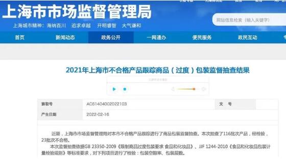 近日,上海市市場監督管理局發布了《2021年上海市不合格產品跟蹤商品(過度)包裝監督抽查結果》。本次監督抽查主要對本市不合格產品跟蹤進行了商品包裝監督抽查,對包裝空隙率、包裝層數兩個項目進行了檢驗。