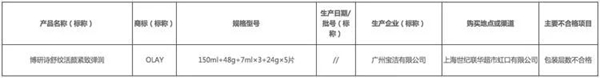 本次抽檢中,一批次標稱由廣州寶潔有限公司生產、上海世紀聯華超市虹口有限公司在售、規格型號為150ml+48g+7ml×3+24g×5片、產品名稱為OLAY博研詩舒紋活顏緊致彈潤的產品,被檢測出包裝層數不合格。