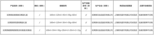 另一批次標稱由珀萊雅化妝品股份有限公司生產、上海歐尚超市有限公司長陽店在售、規格型號為160ml+120ml+30ml+50g+60ml、產品名稱為珀萊雅彈潤透亮精選禮盒的產品,被檢測出包裝空隙率不合格。