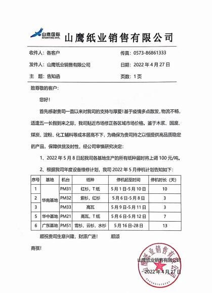 4月27日,山鷹紙業發布客戶告知函,5月8日起,各基地生產的所有紙種上調100元/噸,同時5月份華南、華中和廣東基地的5臺紙機根據設備維修計劃,將停機3-13天不等。