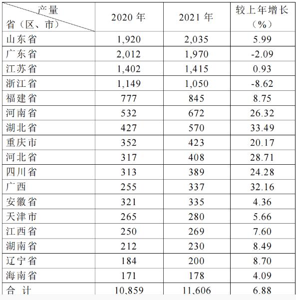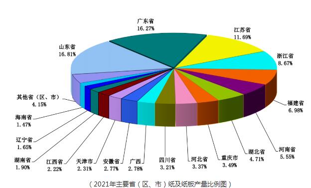 2021年,山東省、廣東省、江蘇省、浙江省、福建省、河南省、湖北省、重慶市、河北省、四川省、廣西壯族自治區(qū)、安徽省、天津市、江西省、湖南省、遼寧省和海南省17個(gè)省(區(qū)、 市)紙及紙板產(chǎn)量超過100萬噸,產(chǎn)量合計(jì)11606萬噸,占全國紙及紙板總產(chǎn)量的95.88%。