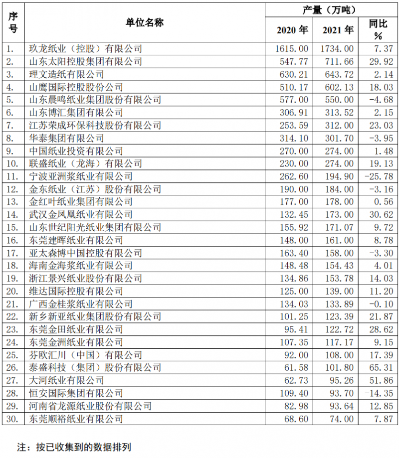 報(bào)告還披露了2021年重點(diǎn)造紙企業(yè)產(chǎn)量前30名企業(yè)排名,玖龍紙業(yè)(控股)有限公司、山東太陽控股集團(tuán)有限公司、理文造紙有限公司、山鷹國際控股股份有限公司和山東晨鳴紙業(yè)集團(tuán)股份有限公司五家企業(yè)排名前五位,產(chǎn)量均超過500萬噸,26家企業(yè)產(chǎn)量超過100萬噸。